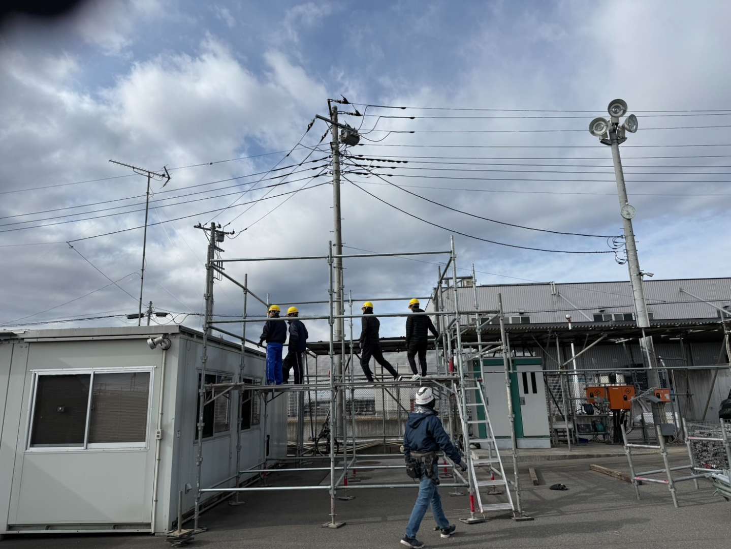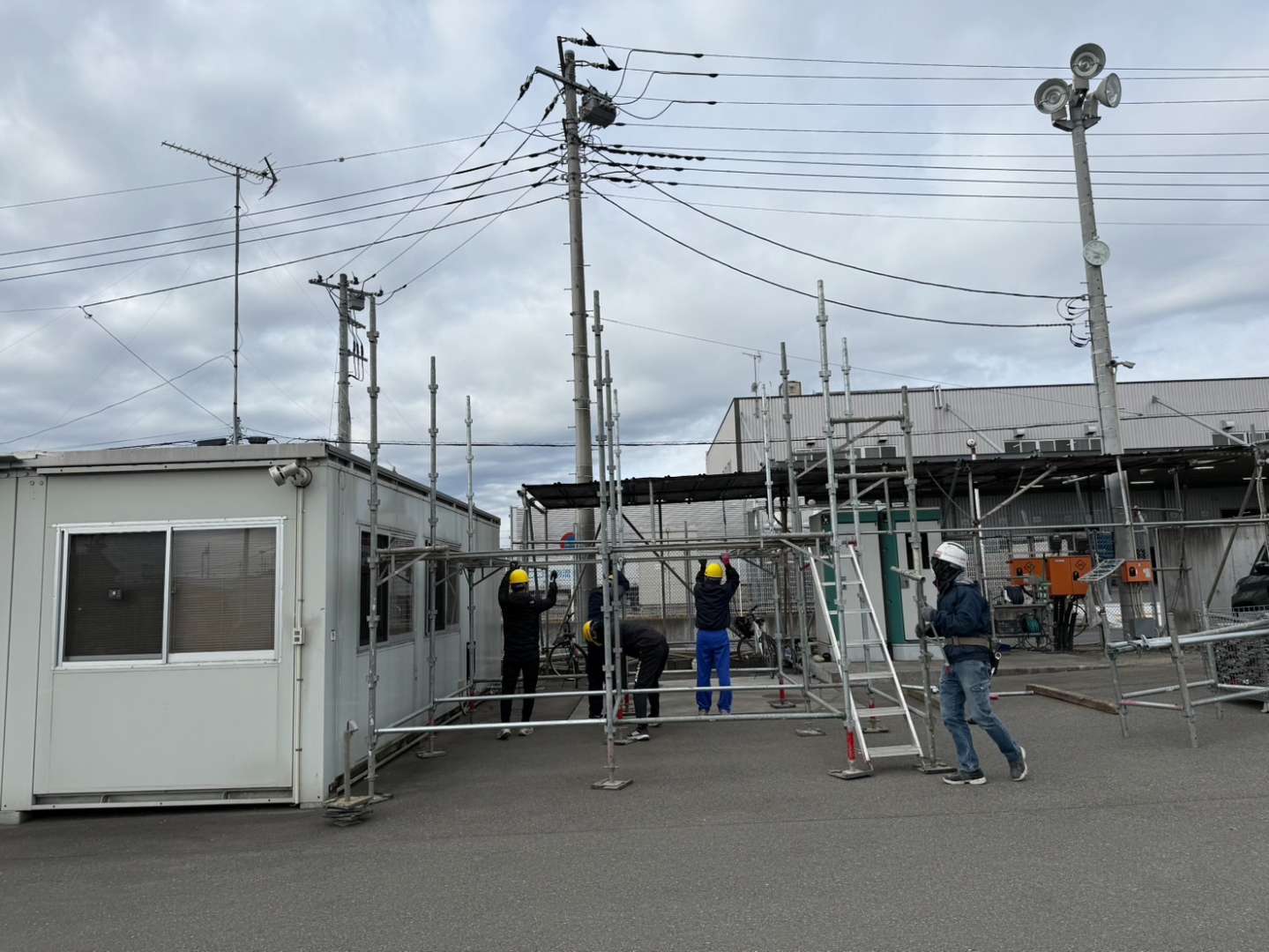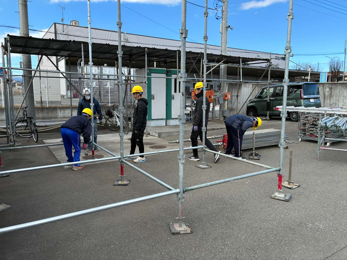 2日目は簡単な足場作りを体験しました。8コマの重さに驚いていたようです。